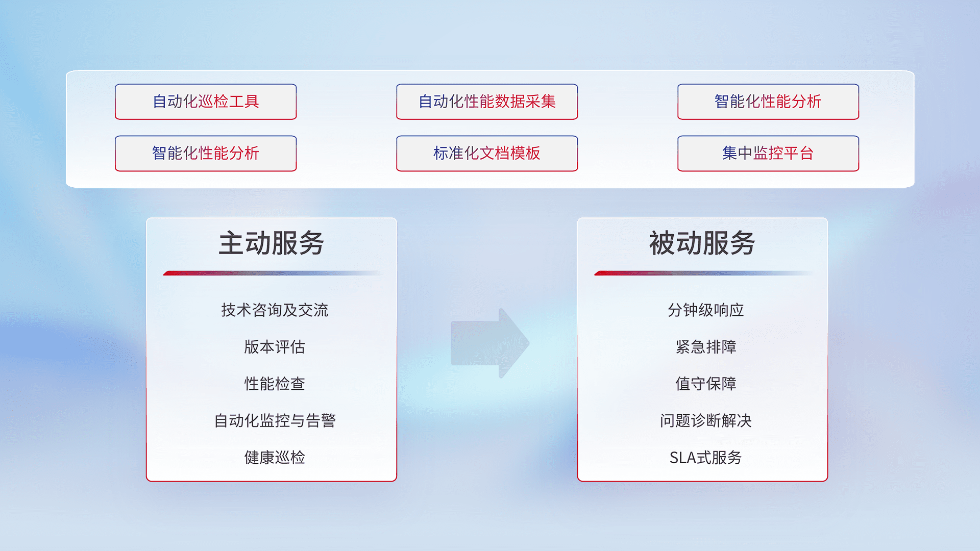 智能化工具和标准化文档,,,,保障服务质量,,,,提供主动服务(包含技术咨询、、、、版本评估、、性能检查、、自动化监控与告警、、、、健康巡检)和被动服务包含(分钟级响应、、、、紧急排障、、、、值守保障、、、问题诊断解决、、SLA服务)。。。。